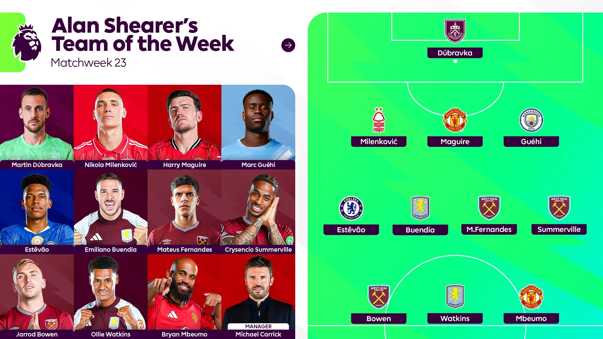 中场:埃斯特旺(切尔西)、布恩迪亚(阿斯顿维拉)、费南德斯(西汉姆联)、萨默维尔(西汉姆联)